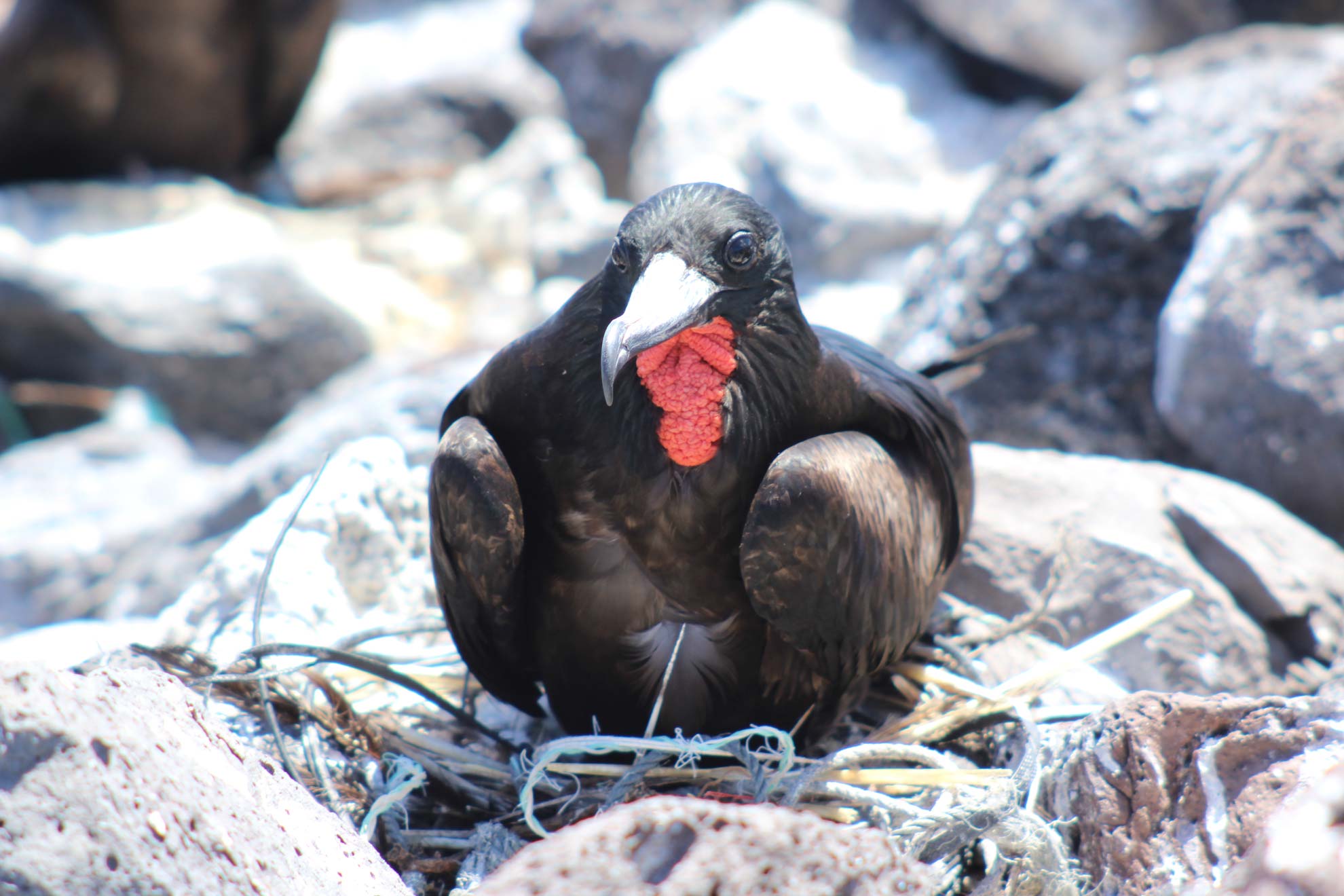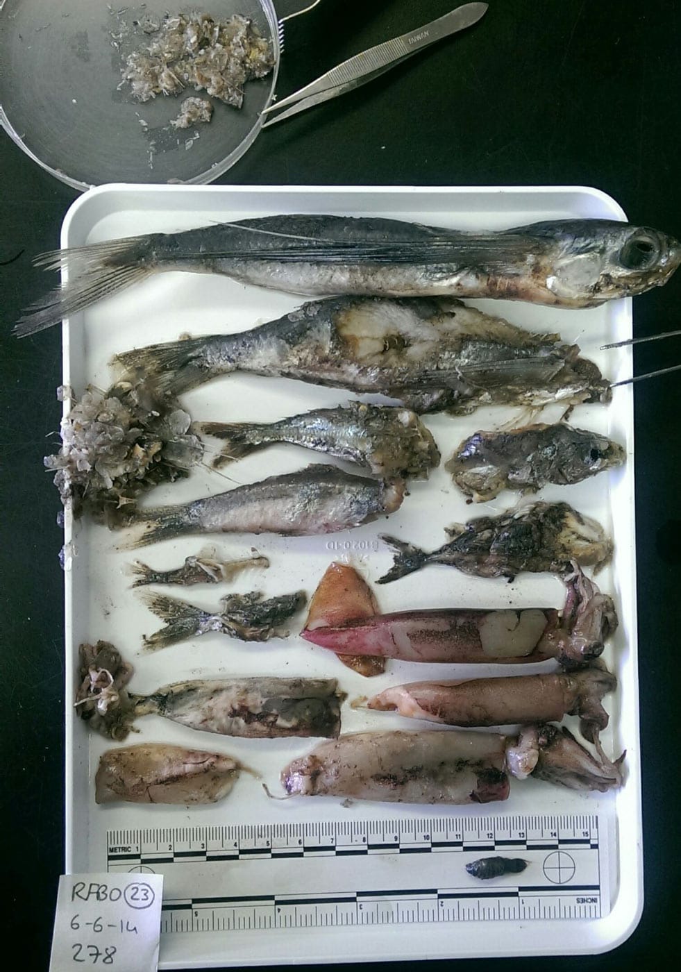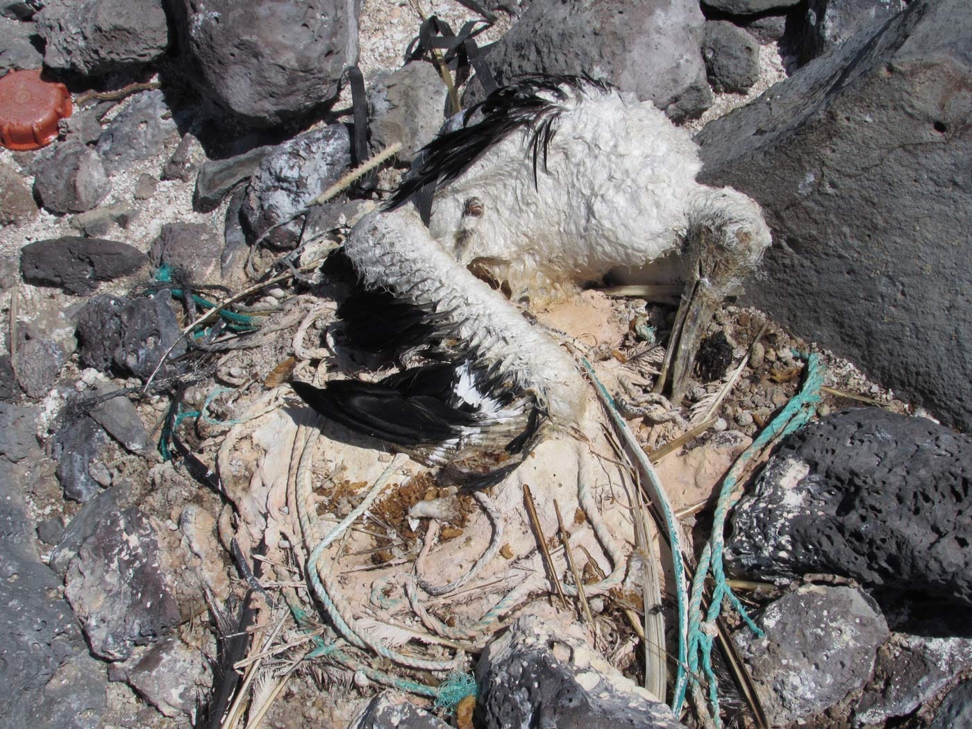 In some cases, such as the frigate birds (makohe), the birds carry plastics to their breeding grounds to build their nests. This can be seen dramatically on Salas y Gomez Island where all the nests of the frigate birds that we were able to examine are made of plastic ropes (see photo 3). In other cases, such as that of the Midway albatross, the parents feed their chicks in the nesting colony with plastics, which are then regurgitated by the young before they leave the nest. However, other species, such as the petrels and the shearwaters, don’t vomit out the plastic that they ingest. Therefore, scientists collect the birds which died accidentally (due to interaction with the fishing industry, to their attraction to street lights or ship lights or by attacks from stray dogs) to do autopsies. This permits us to study their stomach contents and tissues, in order to collect and quantify the rubbish to establish measurements on the quantity and type of plastic in the sea.