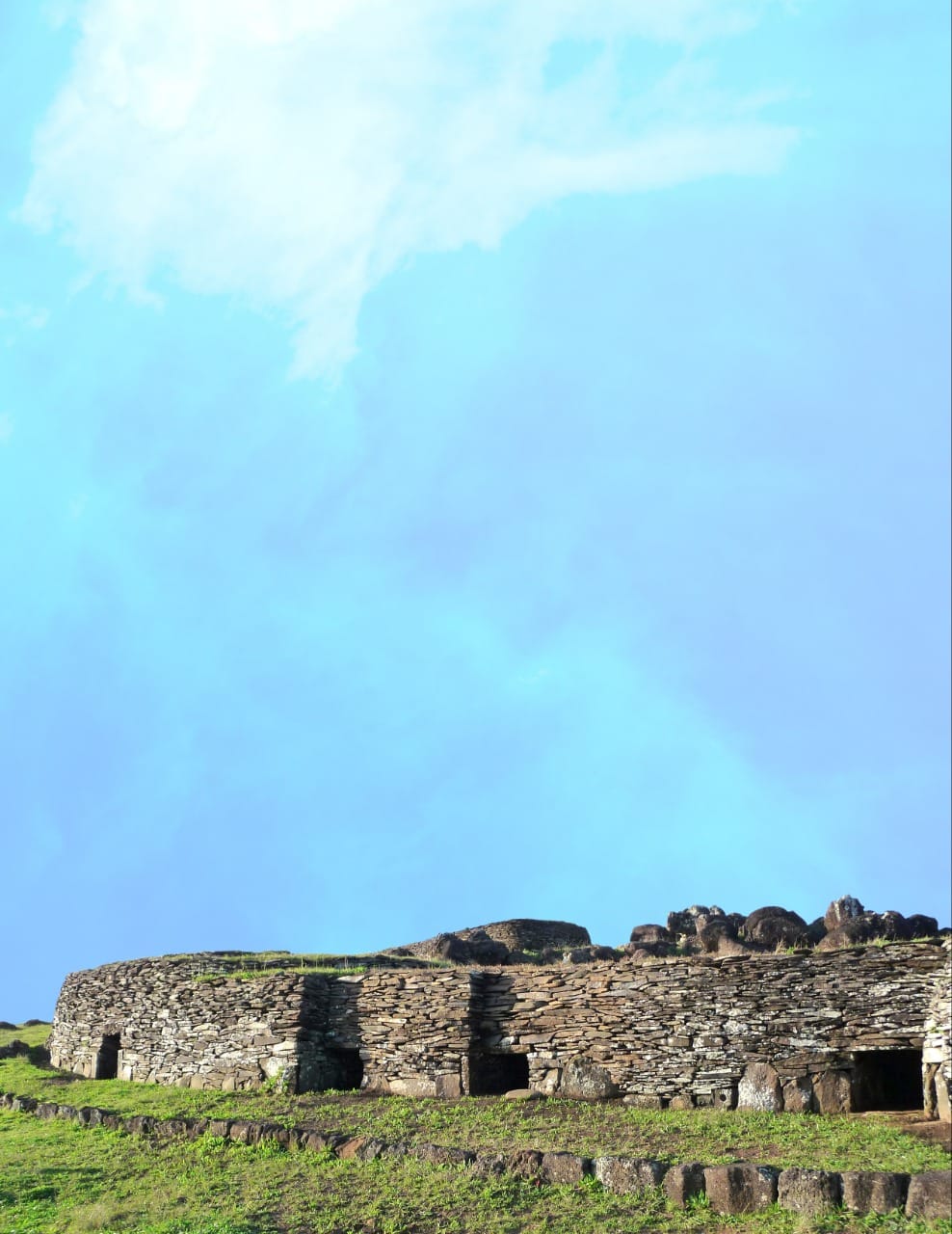 The Ngaru’a were usually basalt shingle rocks from the floor of the sea which were called Poro. They are rather dark, smooth and very hard. Their sizes ranged to a maximum length of 13.5 cm (5.5 inches), a width up to 18 cm (7 in.) and a thickness between 3.7 and 10 cm (1.5 and 4 in.). They could weigh between 0.8 and 5.3 kilograms (1 lb, 12 oz. And 11 lb, 11 oz). They usually had carvings on both sides and edges which might represent the bird-man, the Ao or staff of power and fertility symbols (Komari) or other zoomorphic petroglyphs. There have been no ethnographic explanations for the carvings, but they are a material expression of a rich symbolism and the importance of dreams in the Polynesian world. The Ngaru’a are one of the household artifacts associated with the highest social rank.This type of rock was typically used for the terraces of the Ahu (platforms) and were classified as Poro Nui (large) and Poro Iti (small), but those used as Ngaru’a were intermediate. According to the archaeologist Mulloy, they were found in many places around the Island, but especially in the houses at Orongo, inside the bases of the Hare paenga and at important ceremonial centers, such as Vinapu. This type of rock pillow for the neck have been used in other parts of Polynesia, as well. Some have been found in Tonga, Fiji, Hawaii, Tahiti, the Marquesas and the Society Islands, made of rock or made of wood, and sometimes made of thick trunks of bamboo. These date from the late 18th Century and the early 19th Century.
